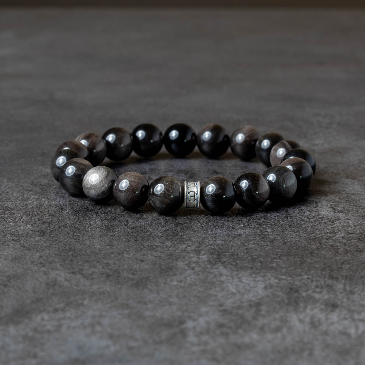 Gloss-black and gray 10 mm obsidian beads with a subtle silvery sheen under light. Strung on durable silicone elastic and finished with our recycled-sterling accent bead—sleek, modern, and slightly mysterious.