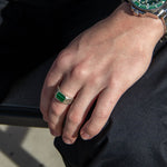 Malachite is often associated with protection and steadiness—strength through change. The Defender takes that spirit and keeps it grounded: a crisp signet silhouette, a deep green stone that feels unmistakably real, and silver work that stays clean from every angle.